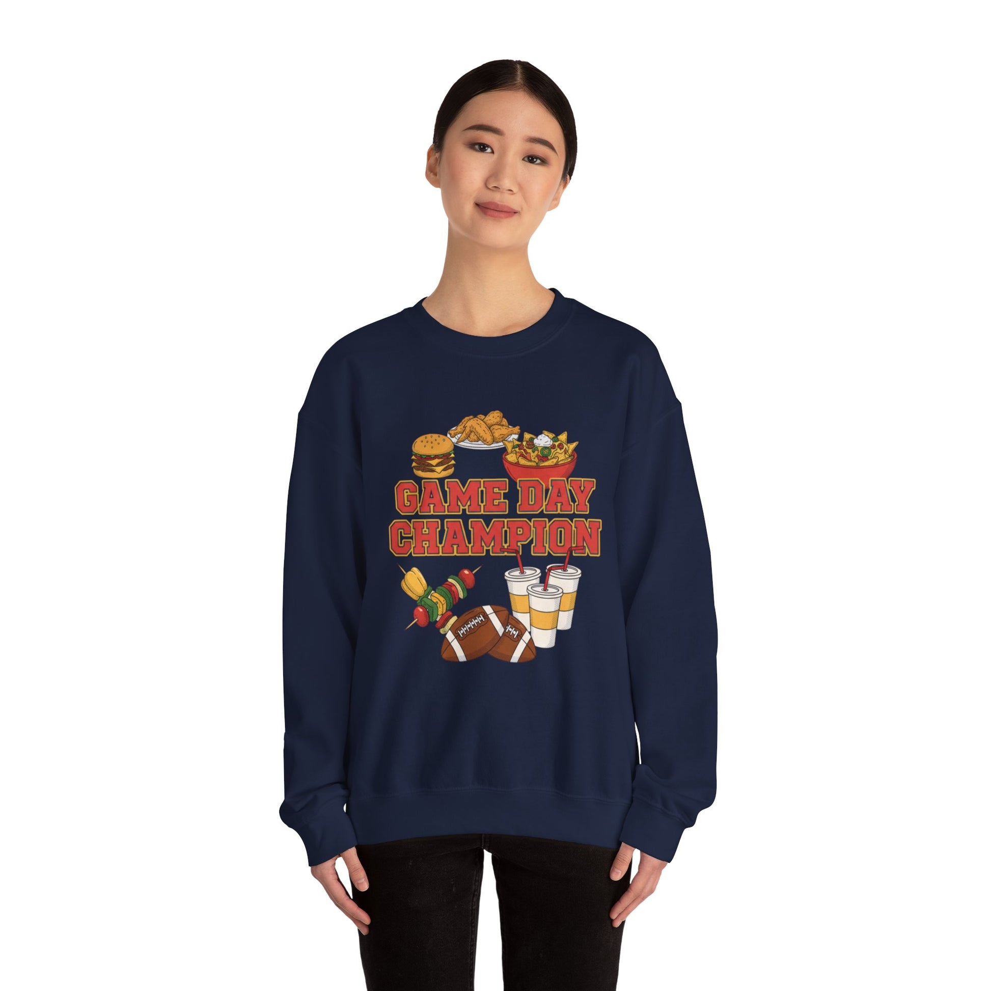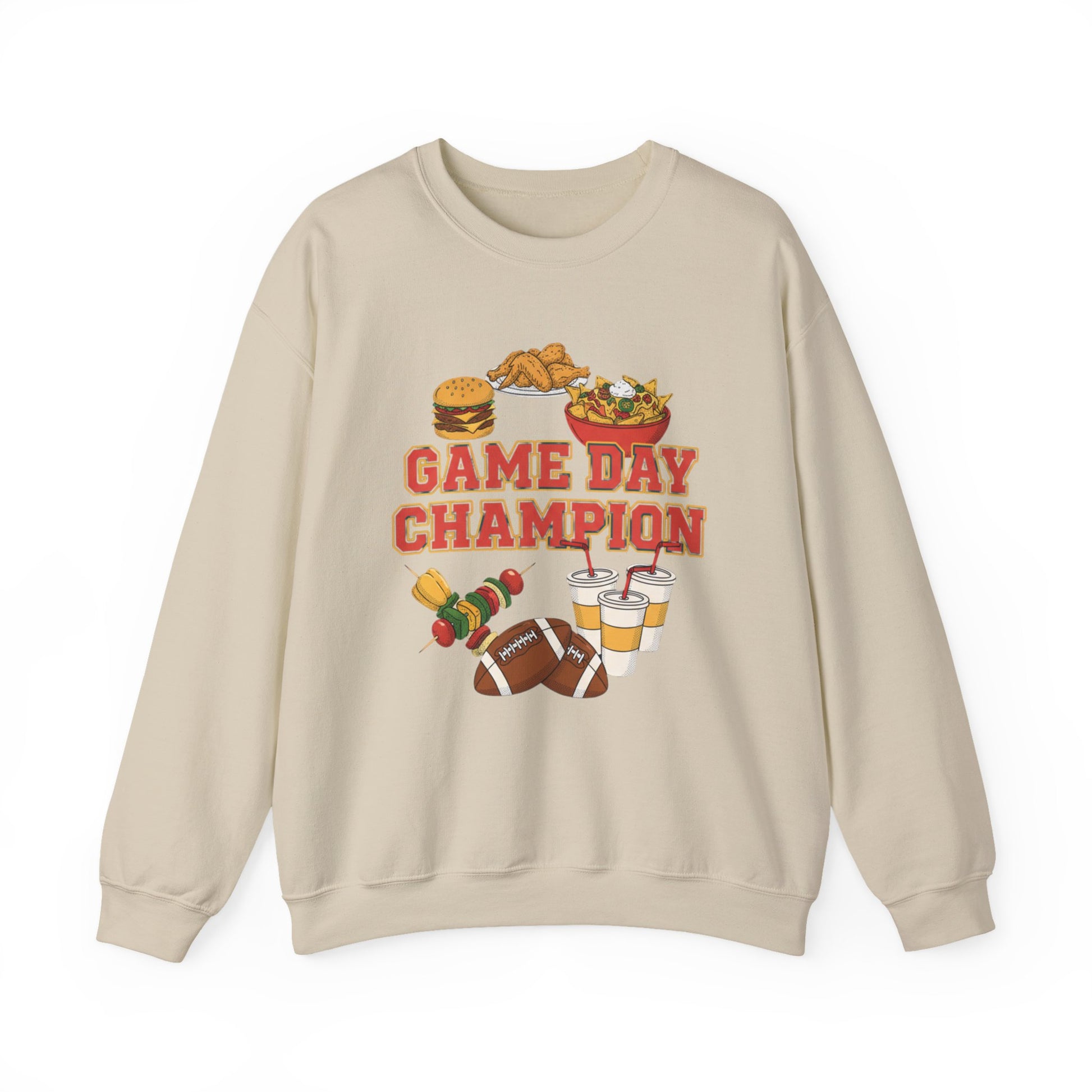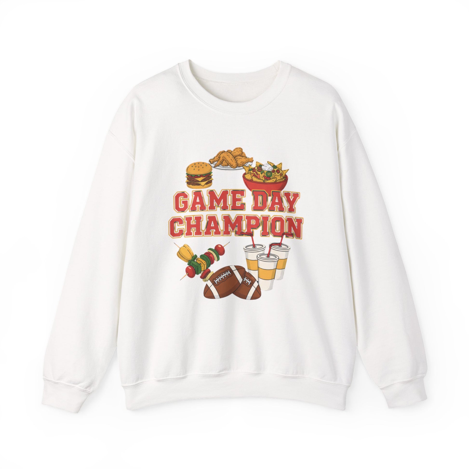 Game-day crewneck celebrating the snack-forward host: bold, retro-inspired block type reading “Game Day Champion” sits over playful embroidered-style food icons—wings, nachos, burger, beer, and a dip bowl—arranged in a badge-like layout. The artwork uses high-contrast, casual sports vibes that match Super Bowl party and game day humor searches, giving a lighthearted, social energy for weekend viewing and hosting. Wear it while tossing appetizers, cheering from the couch, or keeping warm during an energetic pre-game meetup.